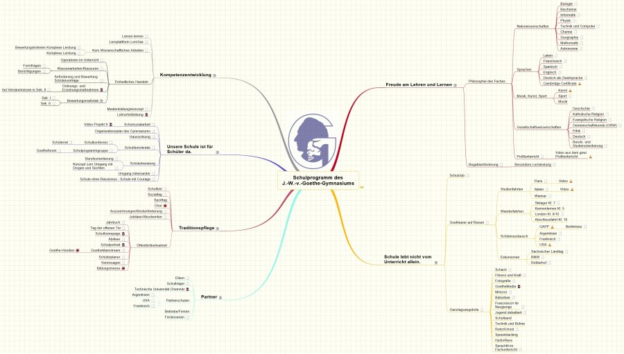 Das Leben an unserer Schule ist so vielfältig, dass es hier nicht annähernd vollständig abgebildet werden kann. Trotzdem wollen wir versuchen unsere Leitlinien mit Hilfe eines Mindmaps darzustellen. Wenn Sie nun das stark verkleinerte Bild dieses Mindmaps anklicken, gelangen Sie zur ausführlichen Darstellung. Am Ende und teilweise auch in den Zweigen des Mindmaps finden Sie verlinkte Dateien mit Erläuterungen, Illustrationen und teilweise sogar mit Videoclips. Dabei benutzen wir die Dateitypen pdf, jpg, mp4, so dass wir hoffen, dass Sie mit Ihrem jeweiligen Endgerät alles anschauen können. Wir empfehlen, nach jeder geöffneten Datei den Rückbutton Ihres Browsers zu benutzen. So gelangen Sie immer wieder in das Mindmap als zentrale Übersicht.